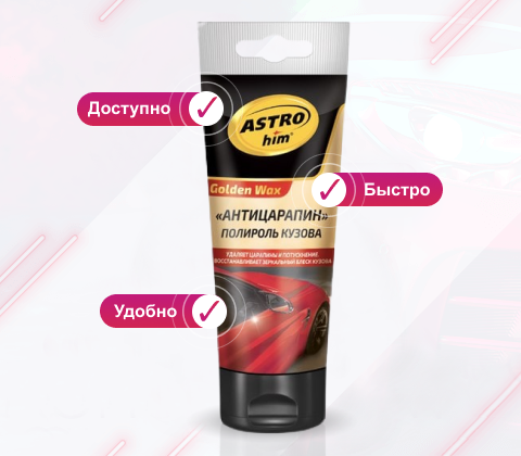 Антицарапин – средство для удаления царапин на кузове, которое быстро и эффективно устраняет повреждения, образующиеся на верхнем слое лакокрасочного покрытия. Восстанавливает глубокий цвет и блеск краски. Полимерные микрочастицы проникают внутрь повреждения и заполняют его, выравнивая поверхность и не причиняя вреда краске.